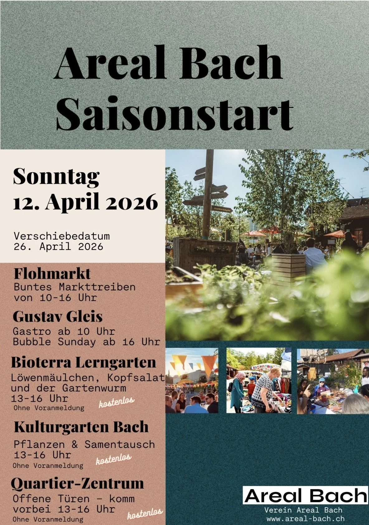 Am 12. April 2026 findet bei trockenem Wetter die Saisoneröffnung statt. Mit dem beliebten Quartier Flohmarkt ab 1o Uhr. Um 13 Uhr starten Workshop im Bioterra Lerngarten und Pflanzentausch im Kulturgarten. Ausserdem öffnet zum ersten Mal das neue Familien und Quartierzentrum seine Türe für Alle.