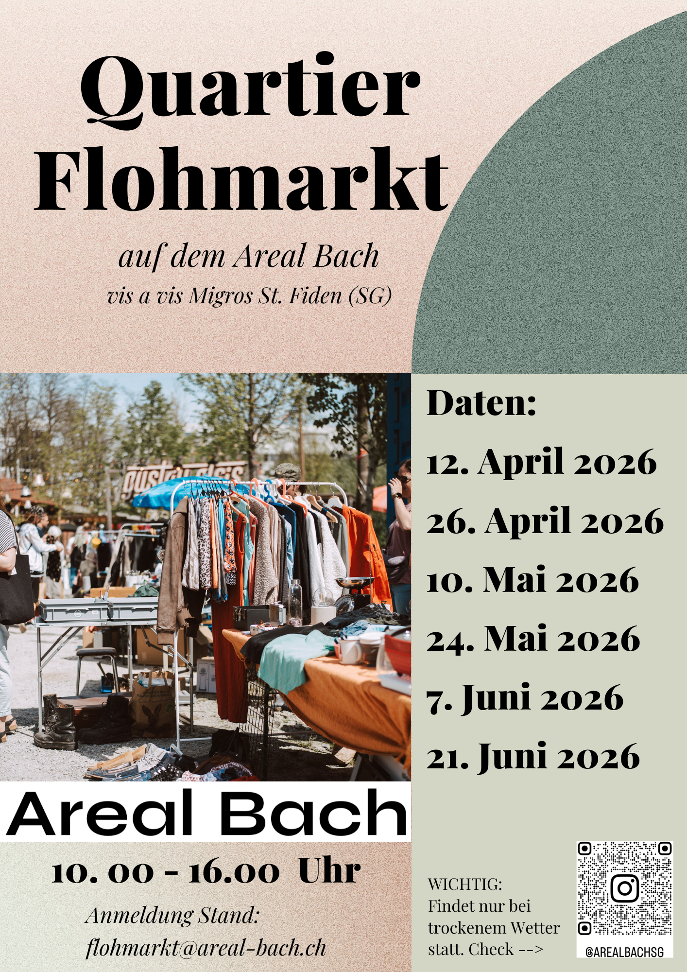 Ab dem 12. April 2026 findet bei trockenem Wetter wieder jeden zweiten Sonntag der beliebte Quartier-Flohmarkt auf dem Areal Bach statt. Hier können Besucherinnen und Besucher Flohmarktwaren, Second-Hand-Kleidung, Vintage-Mode, Accessoires und Kunsthandwerk entdecken.